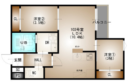 LDK 10.4帖 1室/洋室 3.5帖 1室/洋室 3.0帖 1室 - 向き